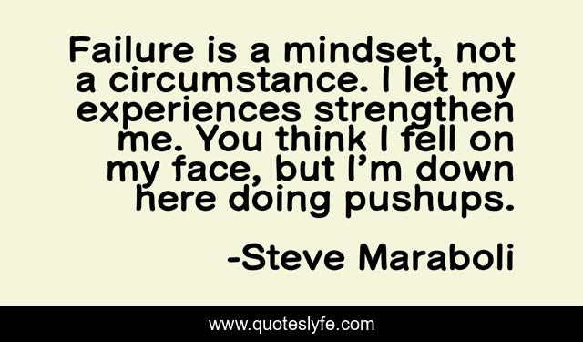 This page presents the quote "Failure is a mindset, not a circumstance. I let my experiences strengthen me. You think I fell on my face, but I’m down here doing pushups.". Author of this quote is Steve Maraboli. This quote is about failure, circumstances, strength, experience, mindset,.