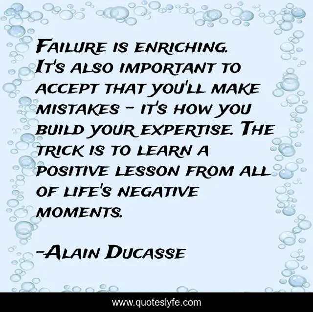 This page presents the quote "Failure is enriching. It's also important to accept that you'll make mistakes - it's how you build your expertise. The trick is to learn a positive lesson from all of life's negative moments.". Author of this quote is Alain Ducasse. This quote is about positive, life, mistakes, confidence,.