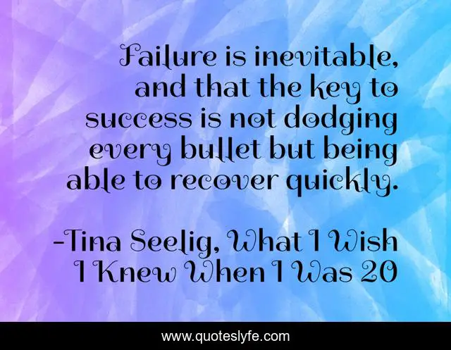 This page presents the quote "Failure is inevitable, and that the key to success is not dodging every bullet but being able to recover quickly.". Author of this quote is Tina Seelig, What I Wish I Knew When I Was 20. This quote is about failure, life, success,.