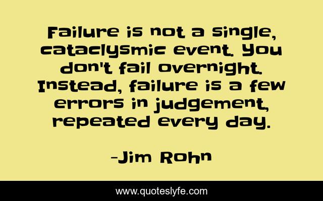 This page presents the quote "Failure is not a single, cataclysmic event. You don't fail overnight. Instead, failure is a few errors in judgement, repeated every day.". Author of this quote is Jim Rohn. This quote is about every day, day,.