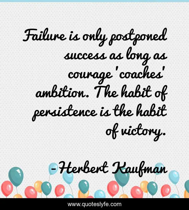 This page presents the quote "Failure is only postponed success as long as courage 'coaches' ambition. The habit of persistence is the habit of victory.". Author of this quote is Herbert Kaufman. This quote is about failures, mistakes,.
