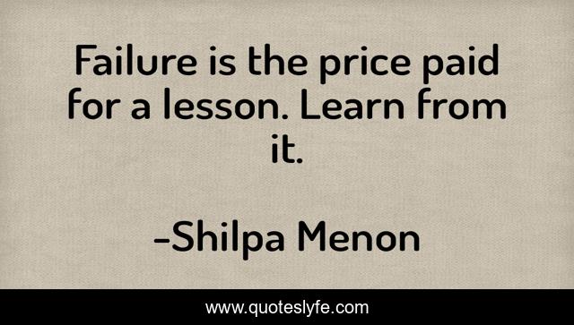 This page presents the quote "Failure is the price paid for a lesson. Learn from it.". Author of this quote is Shilpa Menon. This quote is about experience, success,.