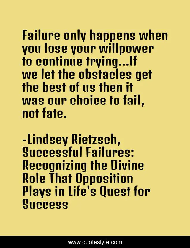 This page presents the quote "Failure only happens when you lose your willpower to continue trying...If we let the obstacles get the best of us then it was our choice to fail, not fate.". Author of this quote is Lindsey Rietzsch, Successful Failures: Recognizing the Divine Role That Opposition Plays in Life's Quest for Success. This quote is about choice-and-attitude, obstacles-of-success, fate, obstacles, willpower, fate-destiny, failure, inspirational, failure-and-success,.