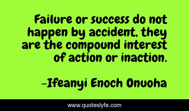 This page presents the quote "Failure or success do not happen by accident, they are the compound interest of action or inaction.". Author of this quote is Ifeanyi Enoch Onuoha. This quote is about success, quote, failure, ifeanyi-enoch-onuoha, inspirational, action, enthusiasm,.