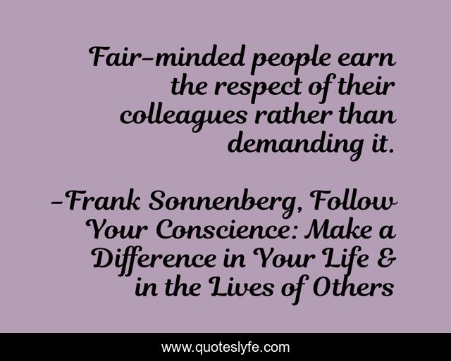 This page presents the quote "Fair-minded people earn the respect of their colleagues rather than demanding it.". Author of this quote is Frank Sonnenberg, Follow Your Conscience: Make a Difference in Your Life & in the Lives of Others. This quote is about leadership, leadership-characteristics,.
