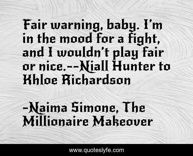 This page presents the quote "Fair warning, baby. I’m in the mood for a fight, and I wouldn’t play fair or nice.--Niall Hunter to Khloe Richardson". Author of this quote is Naima Simone, The Millionaire Makeover. This quote is about makeover, contemporary-romance, alpha-hero, ugly-duckling, best-friends-younger-sister, right-under-your-nose,.