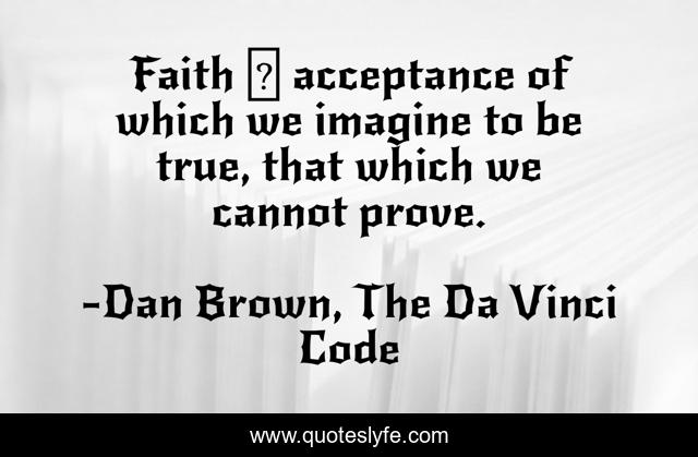 This page presents the quote "Faith ― acceptance of which we imagine to be true, that which we cannot prove.". Author of this quote is Dan Brown, The Da Vinci Code. .