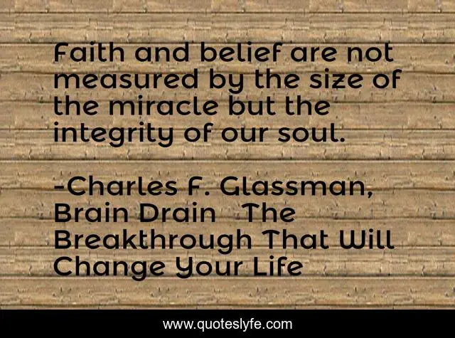 This page presents the quote "Faith and belief are not measured by the size of the miracle but the integrity of our soul.". Author of this quote is Charles F. Glassman, Brain Drain The Breakthrough That Will Change Your Life. This quote is about faith, spiritual, faith-in-yourself, faithfulness, belief, belief-in-god, souls, soul, spirituality,.