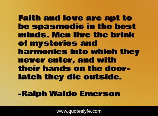 This page presents the quote "Faith and love are apt to be spasmodic in the best minds. Men live the brink of mysteries and harmonies into which they never enter, and with their hands on the door-latch they die outside.". Author of this quote is Ralph Waldo Emerson. This quote is about mystery, faith, love, harmony, affection,.