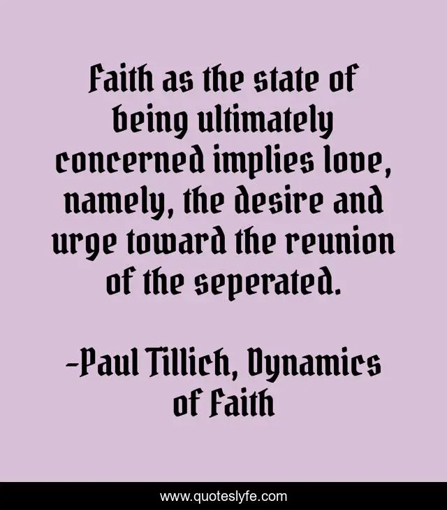This page presents the quote "Faith as the state of being ultimately concerned implies love, namely, the desire and urge toward the reunion of the seperated.". Author of this quote is Paul Tillich, Dynamics of Faith. This quote is about faith, love, affection,.