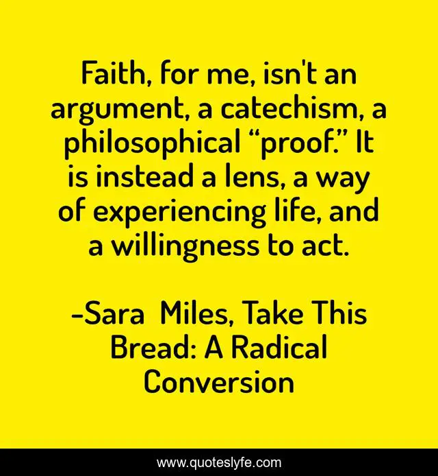 This page presents the quote "Faith, for me, isn't an argument, a catechism, a philosophical “proof.” It is instead a lens, a way of experiencing life, and a willingness to act.". Author of this quote is Sara Miles, Take This Bread: A Radical Conversion. .