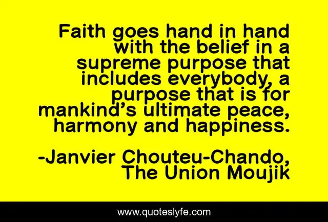 This page presents the quote "Faith goes hand in hand with the belief in a supreme purpose that includes everybody, a purpose that is for mankind’s ultimate peace, harmony and happiness.". Author of this quote is Janvier Chouteu-Chando, The Union Moujik. This quote is about faith, religion, fundamentalism, inspirational, terror, enthusiasm, terrorism,.