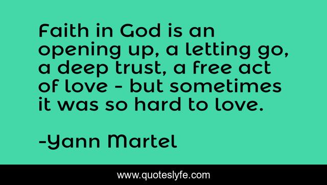 This page presents the quote "Faith in God is an opening up, a letting go, a deep trust, a free act of love - but sometimes it was so hard to love.". Author of this quote is Yann Martel. This quote is about faith, love, god, free, religion, trust, affection,.