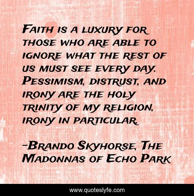 This page presents the quote "Faith is a luxury for those who are able to ignore what the rest of us must see every day. Pessimism, distrust, and irony are the holy trinity of my religion, irony in particular.". Author of this quote is Brando Skyhorse, The Madonnas of Echo Park. This quote is about faith, irony, pessimism, religion, distrust, trinity,.