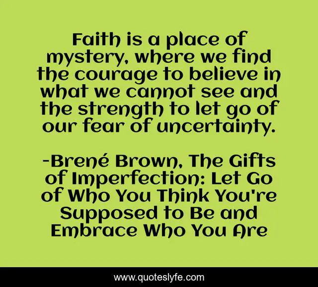 This page presents the quote "Faith is a place of mystery, where we find the courage to believe in what we cannot see and the strength to let go of our fear of uncertainty.". Author of this quote is Brené Brown, The Gifts of Imperfection: Let Go of Who You Think You're Supposed to Be and Embrace Who You Are. .