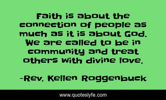 This page presents the quote "Faith is about the connection of people as much as it is about God. We are called to be in community and treat others with divine love.". Author of this quote is Rev. Kellen Roggenbuck. This quote is about faith, christian, god, acceptance, christianity, connection, christian-living, love, affection,.