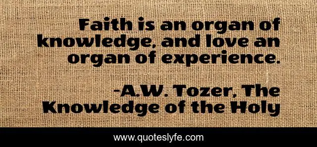 This page presents the quote "Faith is an organ of knowledge, and love an organ of experience.". Author of this quote is A.W. Tozer, The Knowledge of the Holy. This quote is about faith, love, affection, religion,.