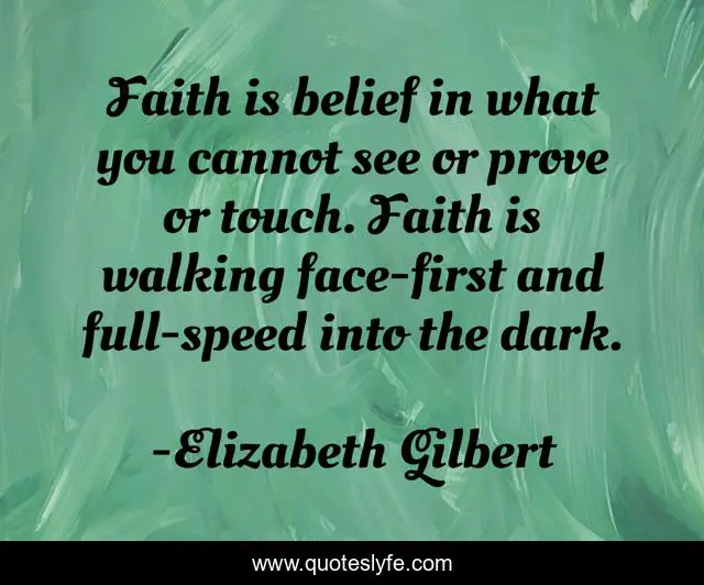 This page presents the quote "Faith is belief in what you cannot see or prove or touch. Faith is walking face-first and full-speed into the dark.". Author of this quote is Elizabeth Gilbert. .