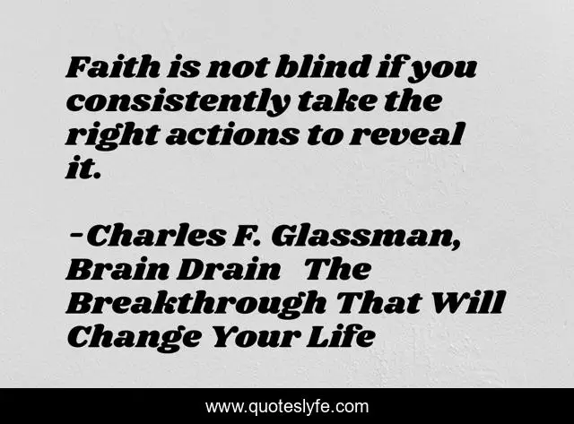 This page presents the quote "Faith is not blind if you consistently take the right actions to reveal it.". Author of this quote is Charles F. Glassman, Brain Drain The Breakthrough That Will Change Your Life. This quote is about action, faith, confidence, positive,.
