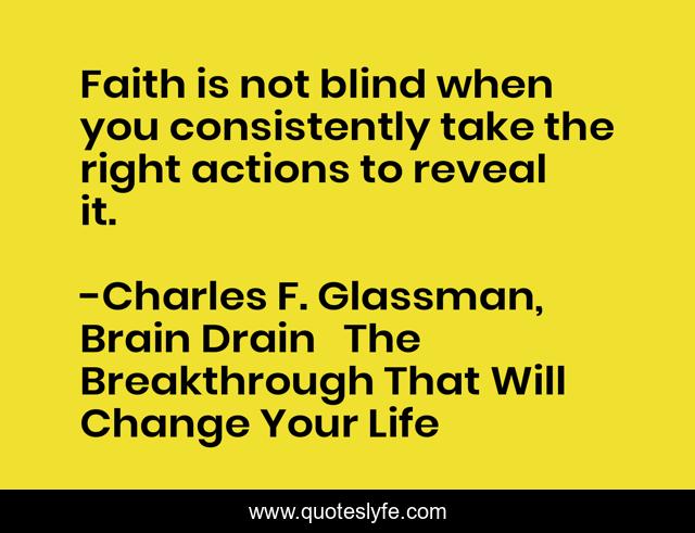 This page presents the quote "Faith is not blind when you consistently take the right actions to reveal it.". Author of this quote is Charles F. Glassman, Brain Drain The Breakthrough That Will Change Your Life. This quote is about action, faith, confidence, positive,.