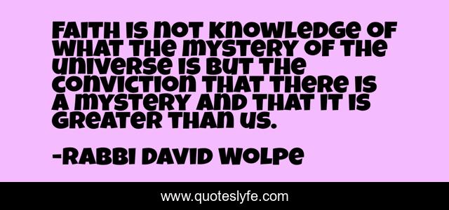 This page presents the quote "Faith is not knowledge of what the mystery of the universe is but the conviction that there is a mystery and that it is greater than us.". Author of this quote is Rabbi David Wolpe. .