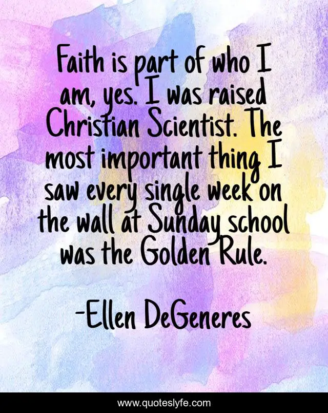 This page presents the quote "Faith is part of who I am, yes. I was raised Christian Scientist. The most important thing I saw every single week on the wall at Sunday school was the Golden Rule.". Author of this quote is Ellen DeGeneres. This quote is about week, school,.