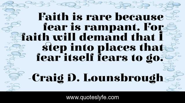 This page presents the quote "Faith is rare because fear is rampant. For faith will demand that I step into places that fear itself fears to go.". Author of this quote is Craig D. Lounsbrough. This quote is about afraid, fearful, fearless, faithless, brave, god, fear, frightened, bravery,.