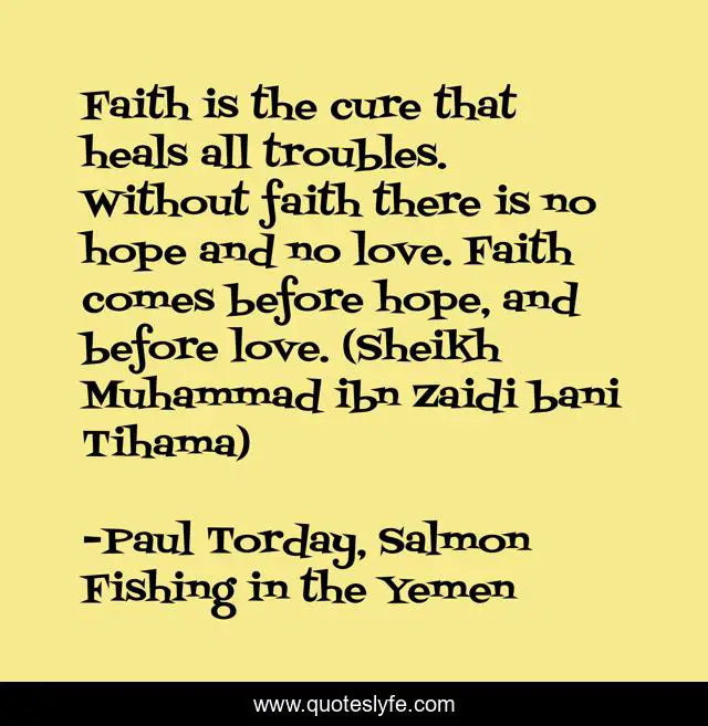 This page presents the quote "Faith is the cure that heals all troubles. Without faith there is no hope and no love. Faith comes before hope, and before love. (Sheikh Muhammad ibn Zaidi bani Tihama)". Author of this quote is Paul Torday, Salmon Fishing in the Yemen. .