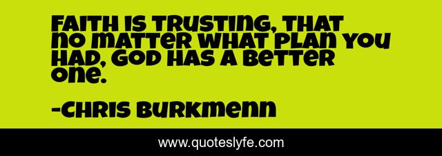 This page presents the quote "Faith is trusting, that no matter what plan you had, God has a better one.". Author of this quote is Chris Burkmenn. This quote is about faith, god, work, jesus, live, dreams, believe, achieve, goals,.