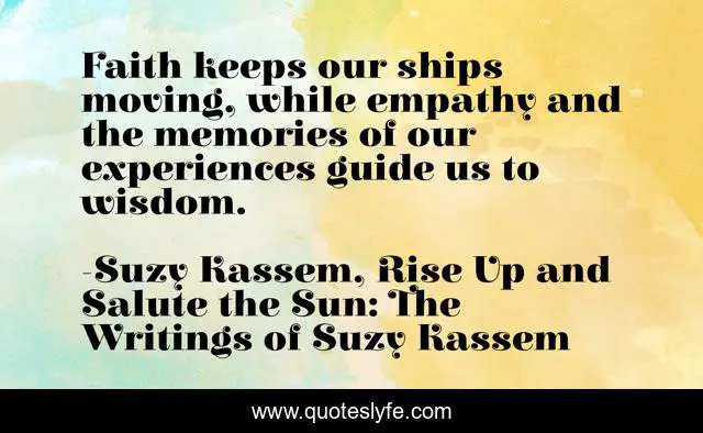 This page presents the quote "Faith keeps our ships moving, while empathy and the memories of our experiences guide us to wisdom.". Author of this quote is Suzy Kassem, Rise Up and Salute the Sun: The Writings of Suzy Kassem. This quote is about faith, empathy, wise, remember, memories, wisdom, past, future, experiences,.