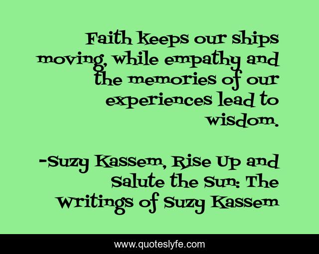 This page presents the quote "Faith keeps our ships moving, while empathy and the memories of our experiences lead to wisdom.". Author of this quote is Suzy Kassem, Rise Up and Salute the Sun: The Writings of Suzy Kassem. This quote is about faith, direction, empathy, wise, destiny, fate, direction-of-your-destiny, memories, inspirational,.