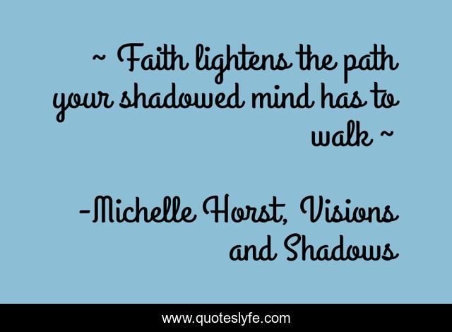 This page presents the quote "~ Faith lightens the path your shadowed mind has to walk ~". Author of this quote is Michelle Horst, Visions and Shadows. This quote is about faith, hopeful, encouraging, inspirational-wisdom, inspirational, enthusiasm, hope,.