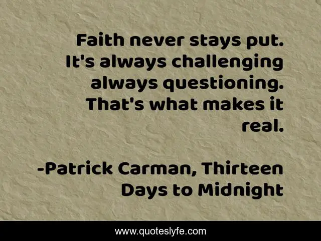 This page presents the quote "Faith never stays put. It's always challenging always questioning. That's what makes it real.". Author of this quote is Patrick Carman, Thirteen Days to Midnight. .