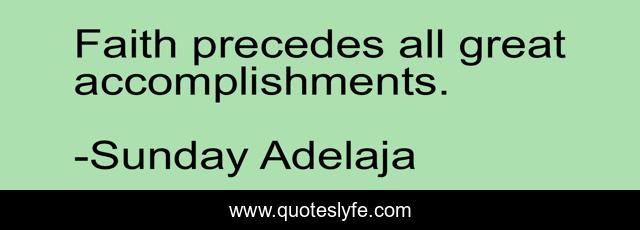 This page presents the quote "Faith precedes all great accomplishments.". Author of this quote is Sunday Adelaja. This quote is about faith, great, accomplishments, precedes,.