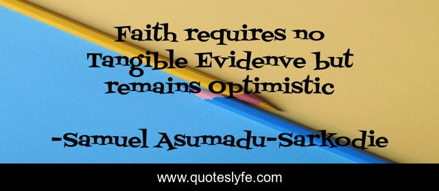 This page presents the quote "Faith requires no Tangible Evidenve but remains Optimistic". Author of this quote is Samuel Asumadu-Sarkodie. This quote is about proverbs, words-of-knowledge, discernment, parables, words-of-wisdom, inspiration,.