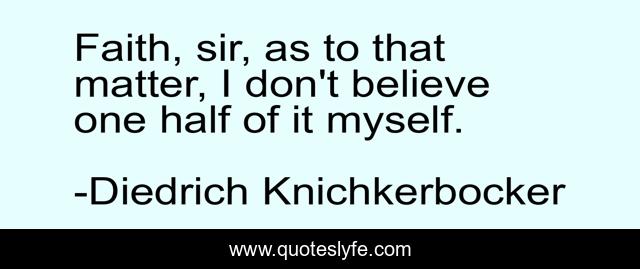 This page presents the quote "Faith, sir, as to that matter, I don't believe one half of it myself.". Author of this quote is Diedrich Knichkerbocker. This quote is about faith, believe,.