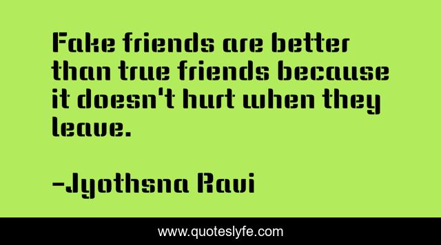 This page presents the quote "Fake friends are better than true friends because it doesn't hurt when they leave.". Author of this quote is Jyothsna Ravi. This quote is about friendship, loyalty,.