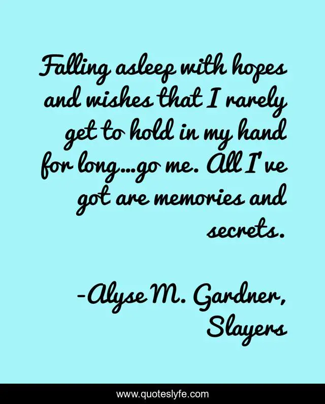 This page presents the quote "Falling asleep with hopes and wishes that I rarely get to hold in my hand for long…go me. All I’ve got are memories and secrets.". Author of this quote is Alyse M. Gardner, Slayers. This quote is about heartache, love, secrets, memories, missing-someone, emotions, feelings, romance, wishes,.