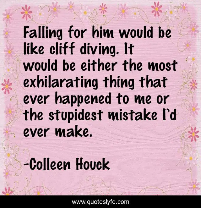 This page presents the quote "Falling for him would be like cliff diving. It would be either the most exhilarating thing that ever happened to me or the stupidest mistake I’d ever make.". Author of this quote is Colleen Houck. This quote is about romance, love, love-struck, affection,.