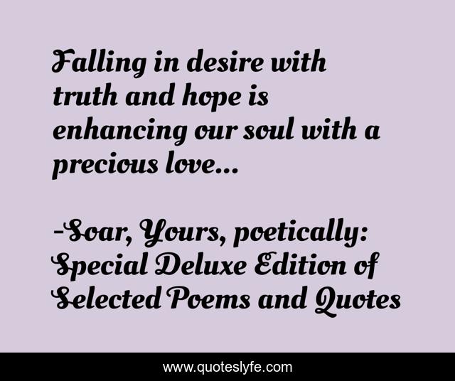 This page presents the quote "Falling in desire with truth and hope is enhancing our soul with a precious love...". Author of this quote is Soar, Yours, poetically: Special Deluxe Edition of Selected Poems and Quotes. This quote is about life, love, people, poetry, hope, affection,.