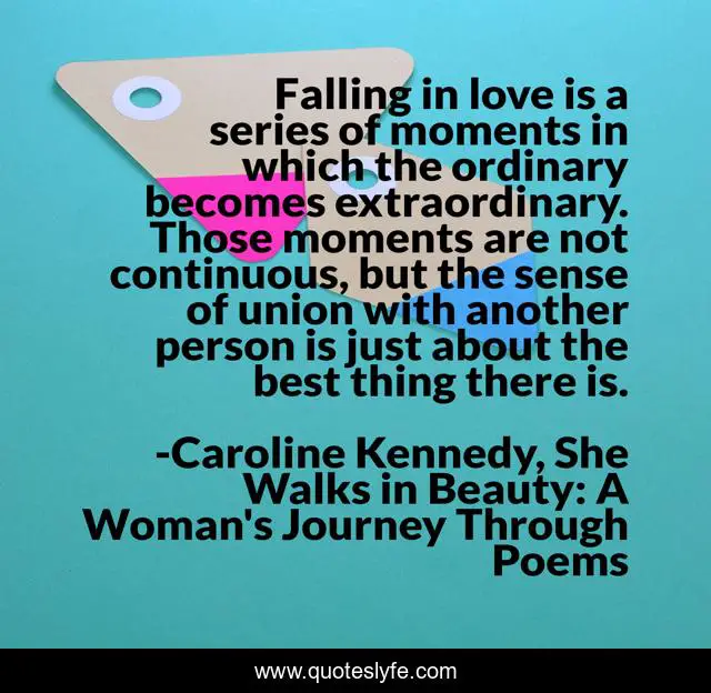 This page presents the quote "Falling in love is a series of moments in which the ordinary becomes extraordinary. Those moments are not continuous, but the sense of union with another person is just about the best thing there is.". Author of this quote is Caroline Kennedy, She Walks in Beauty: A Woman's Journey Through Poems. This quote is about union, love, couple, marriage, affection,.