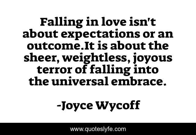 This page presents the quote "Falling in love isn't about expectations or an outcome.It is about the sheer, weightless, joyous terror of falling into the universal embrace.". Author of this quote is Joyce Wycoff. This quote is about love, expectations, affection,.