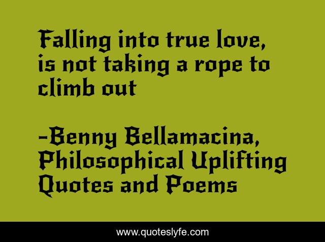 This page presents the quote "Falling into true love, is not taking a rope to climb out". Author of this quote is Benny Bellamacina, Philosophical Uplifting Quotes and Poems. This quote is about life, love, observation, quote, philosophy, wisdom, insperation, affection, inspiration,.