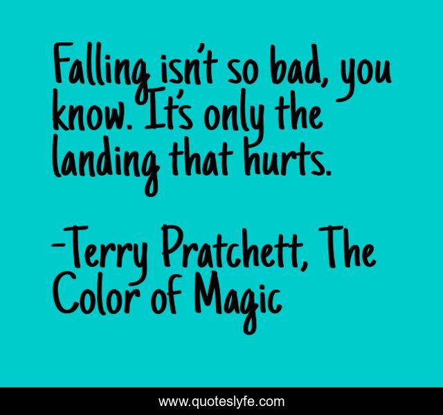 This page presents the quote "Falling isn’t so bad, you know. It’s only the landing that hurts.". Author of this quote is Terry Pratchett, The Color of Magic. This quote is about bad, falling, landing, hurts,.
