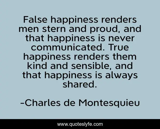 This page presents the quote "False happiness renders men stern and proud, and that happiness is never communicated. True happiness renders them kind and sensible, and that happiness is always shared.". Author of this quote is Charles de Montesquieu. This quote is about kind, men, proud,.