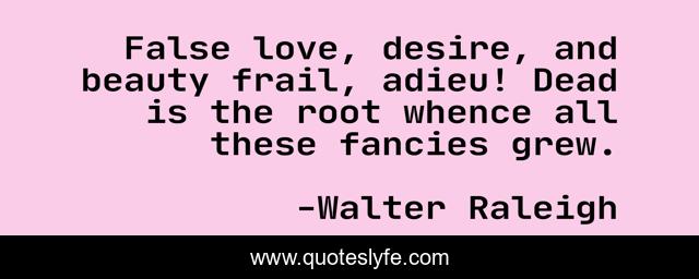 This page presents the quote "False love, desire, and beauty frail, adieu! Dead is the root whence all these fancies grew.". Author of this quote is Walter Raleigh. This quote is about desire, love, poetry, affection,.