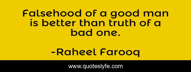 This page presents the quote "Falsehood of a good man is better than truth of a bad one.". Author of this quote is Raheel Farooq. This quote is about falsehood, character, virtue, truth,.