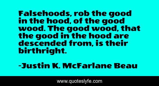 This page presents the quote "Falsehoods, rob the good in the hood, of the good wood. The good wood, that the good in the hood are descended from, is their birthright.". Author of this quote is Justin K. McFarlane Beau. This quote is about israel, goodness, iniquity, lies, the-prince-of-the-2-lands, ancestry, robbery, falsehoods,.