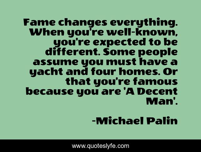This page presents the quote "Fame changes everything. When you're well-known, you're expected to be different. Some people assume you must have a yacht and four homes. Or that you're famous because you are 'A Decent Man'.". Author of this quote is Michael Palin. This quote is about man, changes, people,.