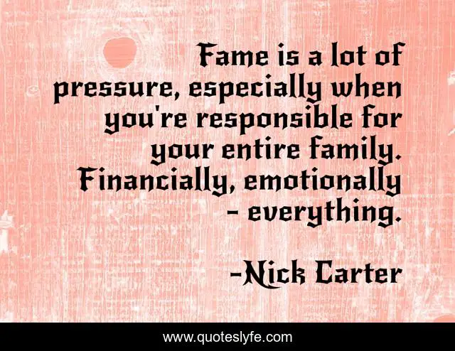 This page presents the quote "Fame is a lot of pressure, especially when you're responsible for your entire family. Financially, emotionally - everything.". Author of this quote is Nick Carter. This quote is about pressure, family,.